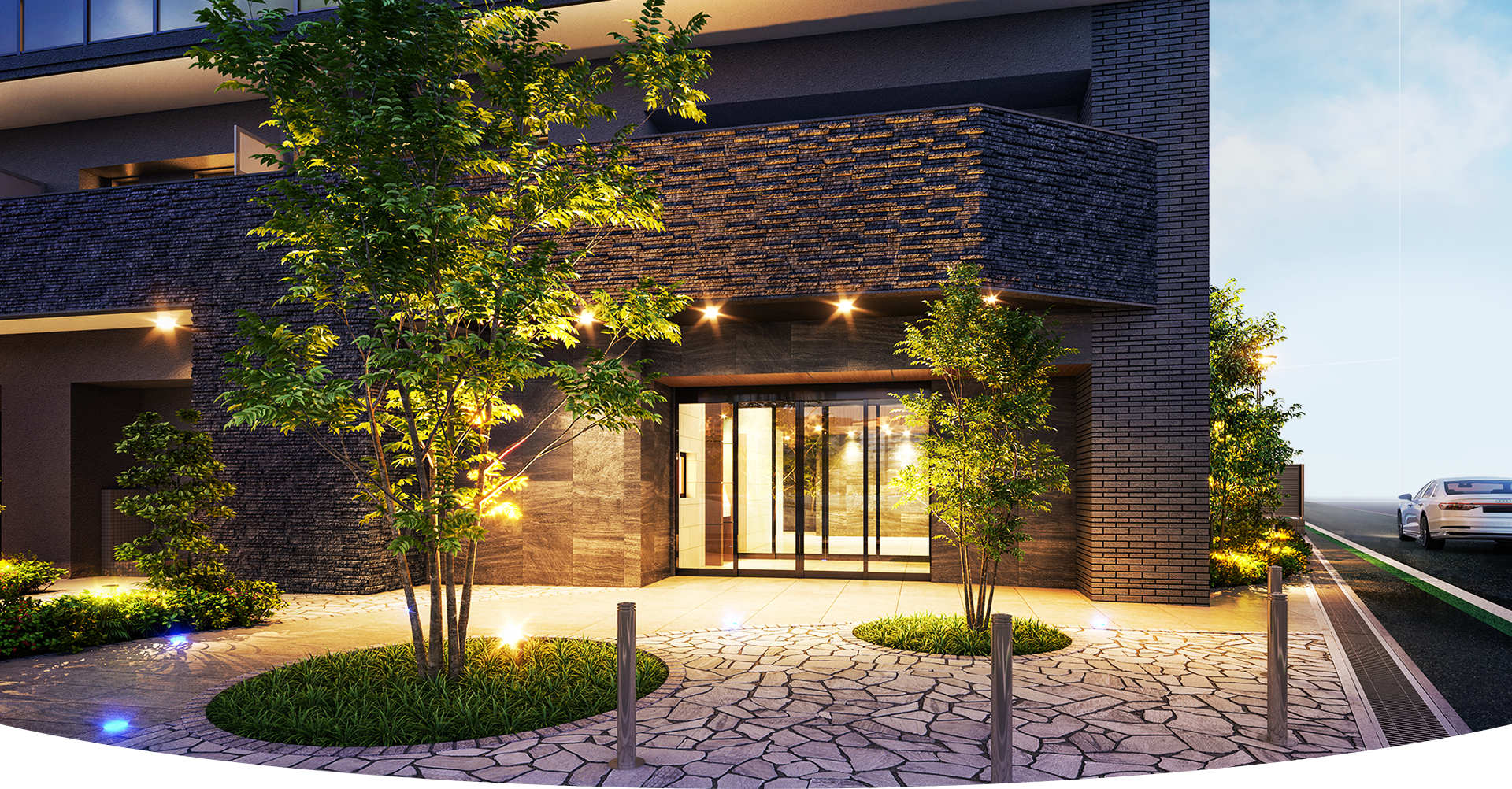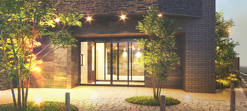 低層部はブラックを基調にして重厚感を持たせ、都市に上質な佇まいを創出します。