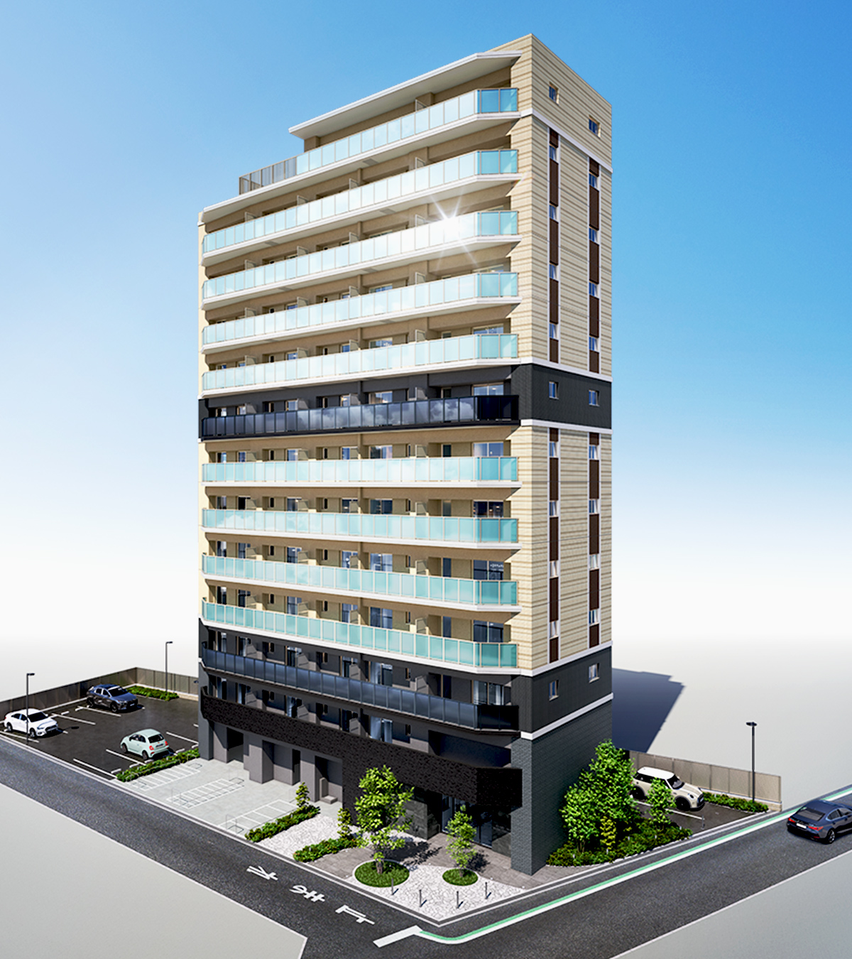 2方接道の開放的な角地を活かして13階建て56戸を設計。